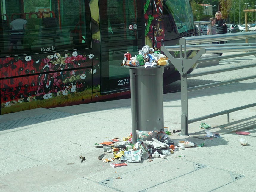 Nouvelle station « Mosson » à Montpellier, les poubelles débordaient ce samedi 14 avril 2012.