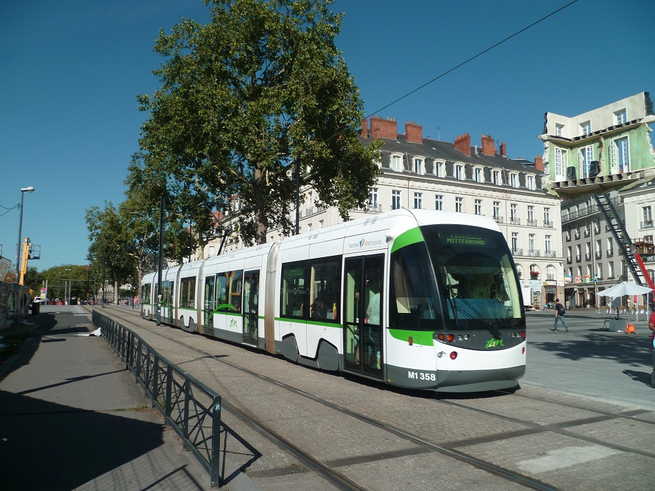 A Nantes, sur la ligne 1, la rame 358 Incentro ADtranz passe devant l’oeuvre de l’artiste Leandro Erlich installée sur la place du Bouffay. Photo prise le vendredi 17 août 2012