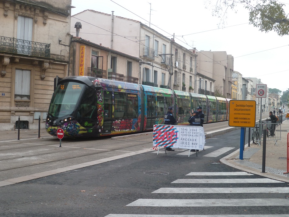 La rame 2075 Citadis 402 Alstom est photographiée au bas de l’avenue de Lodève, une des portes d’entrée de la Zone Artistique Temporaire organisée ce second semestre de l’année 2012 dans le quartier des Arceaux à Montpellier, du 10 au 11 novembre. Photo prise le samedi 10 novembre 2012