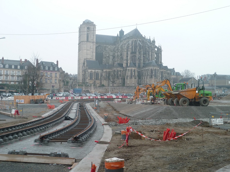 Place des Jacobins au Mans où ont été posés les premiers rails de la branche de 3,4 km qui donnera naissance à la ligne T2 (30/03/2013). Copyright : Edouard Paris