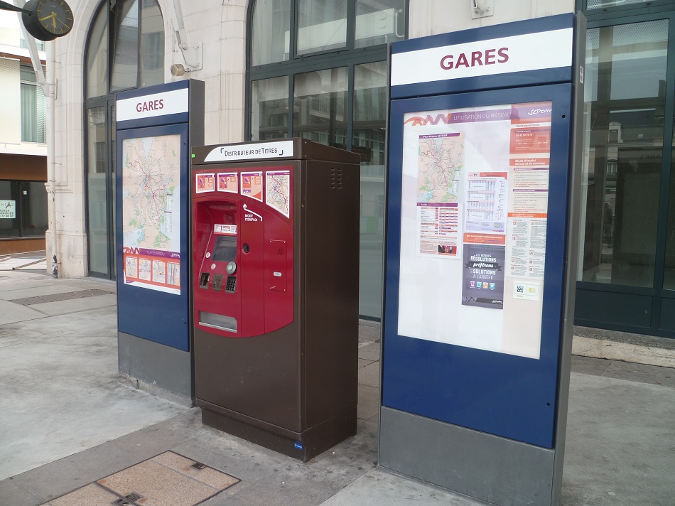 Au Mans, distributeur de titres de transport et panneaux d’information de la station « Gares », quai directions « Entarès-MMArena » et « Espal-Arche de la Nature » (30/03/2013). Copyright : Edouard Paris