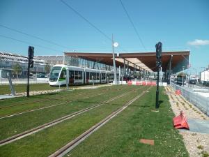 - La rame 387 Urbos 3 CAF à destination de « Beaujoire » marque l’arrêt le long du quai D à la station multimodale « Haluchère-Batignolles » à Nantes (20/04/2013)