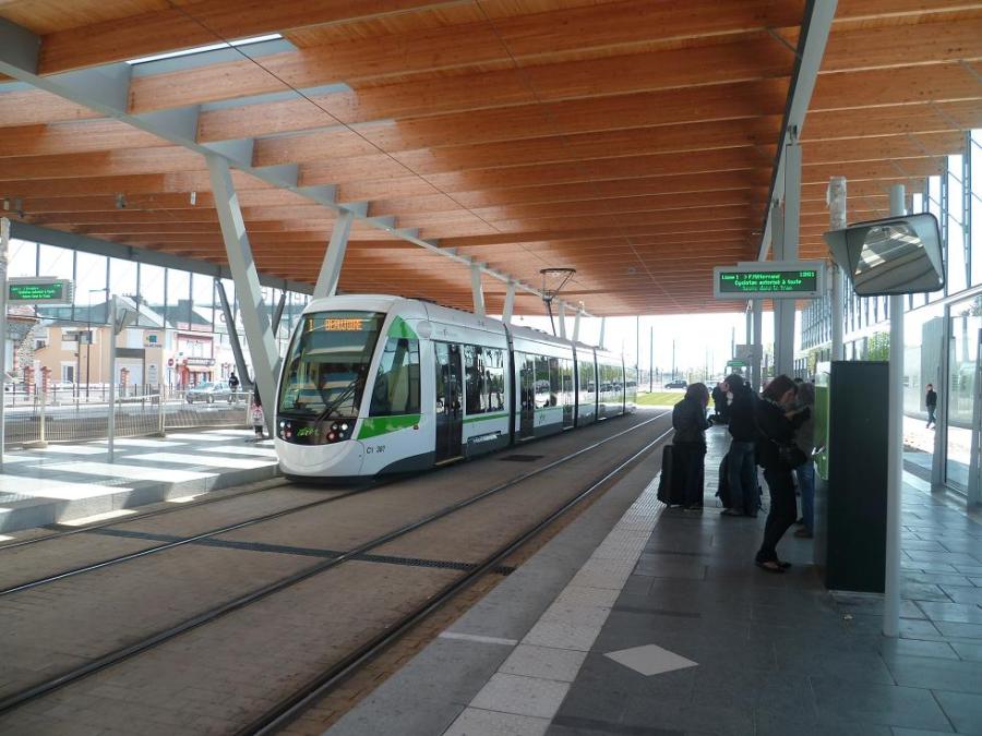 La rame 387 Urbos 3 CAF à destination de « Beaujoire » marque l’arrêt le long du quai D à la station multimodale « Haluchère-Batignolles » à Nantes (20/04/2013)