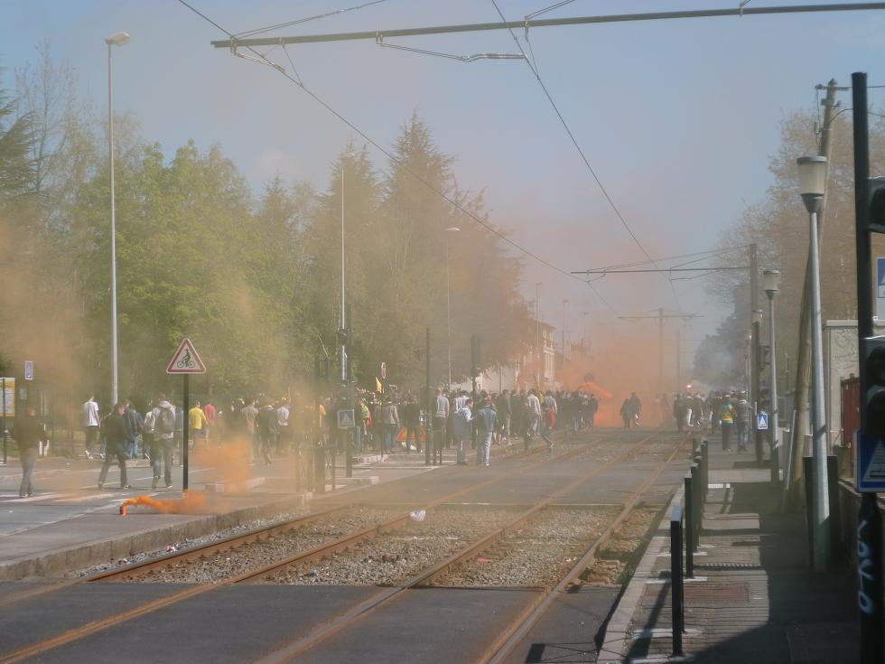 Pour les 70 ans du FC Nantes, les supporteurs de la brigade Loire ont allumé des fumigènes entre les stations « Haluchère-Batignolles » et « Halvêque », le samedi 20 avril 2013