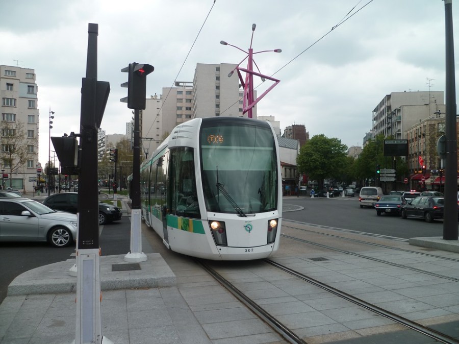 La rame 302 Citadis 402 Alstom traverse le rond-point de la porte de Bagnolet en direction de « Porte de la Chapelle » T3b (28/04/2013)