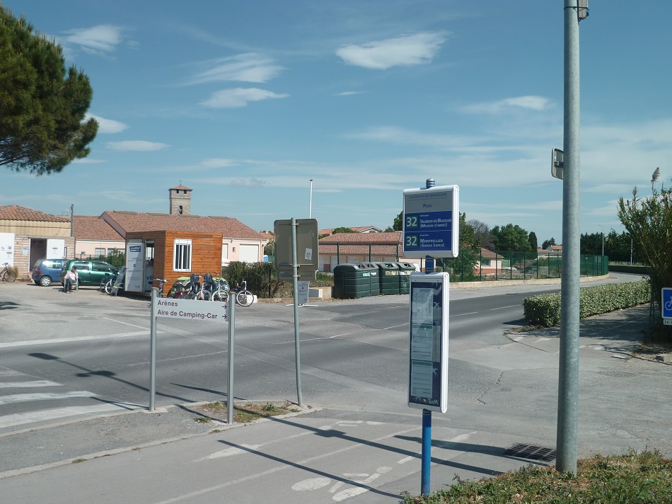 Arrêt « Pilou » de la ligne 32 à Villeneuve-lès-Maguelone et station Vélomagg’Plage. Photo prise le samedi 1er juin 2013 par Edouard Paris