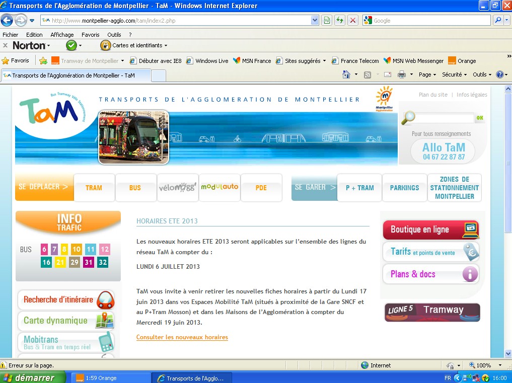 Copie écran de la page d’accueil du site TaM, le samedi 15 juin 2013