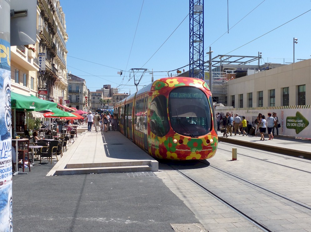 La rame 2063 Citadis 302 Alstom marque l’arrêt à la hauteur du nouveau quai de secours « Gare Saint-Roch » sur voie 2, le vendredi 5 juillet 2013. Copyright : Louis Ferdinand