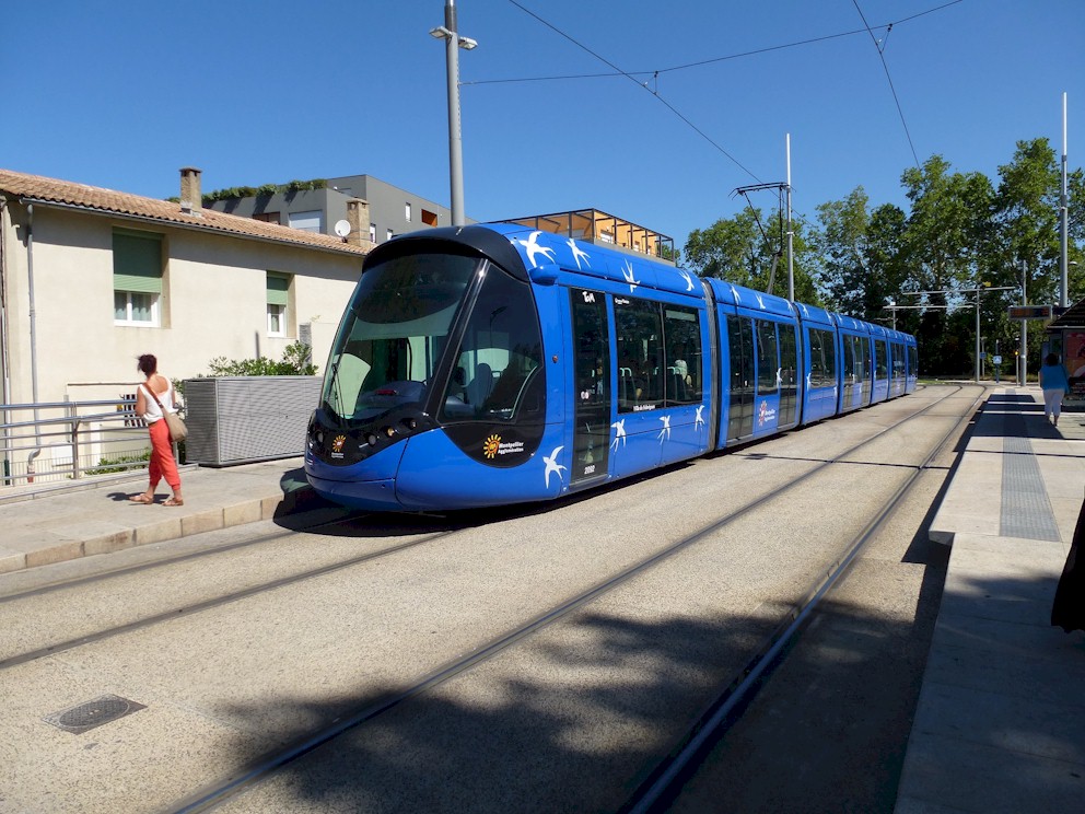 La rame 2092 Citadis 402 Alstom de la ligne 1 est photographiée à la station « Pompignane » de la ligne 4, le vendredi 5 juillet 2013. Copyright : Louis Ferdinand