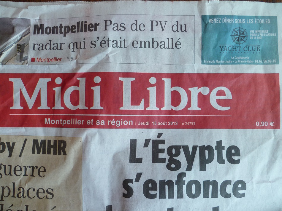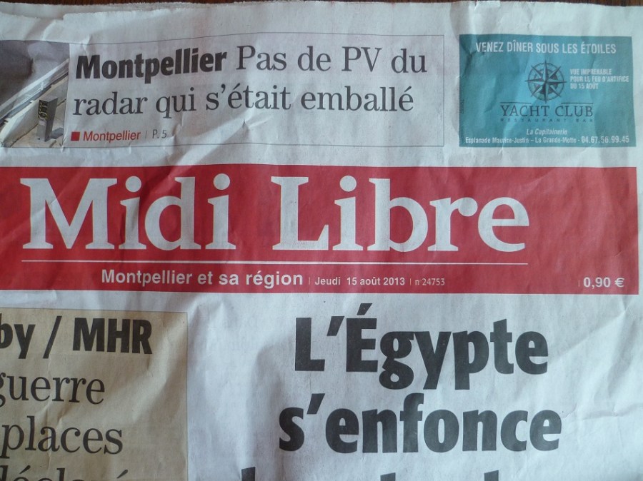 Le quotidien Midi Libre au prix de 0,90 € au lieu de 1,00 €, ce jeudi 15 août 2013. Copyright : Edouard Paris