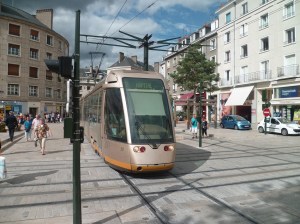 Passage éclair au centre-ville d’Orléans, le samedi après-midi 31 août 2013, afin de photographier la seule intersection en France de deux lignes de tramway, dont une est alimentée par la ligne aérienne de contact (LAC) et l’autre, à cet endroit là, par l’alimentation par le sol (APS), place du Général de Gaulle.