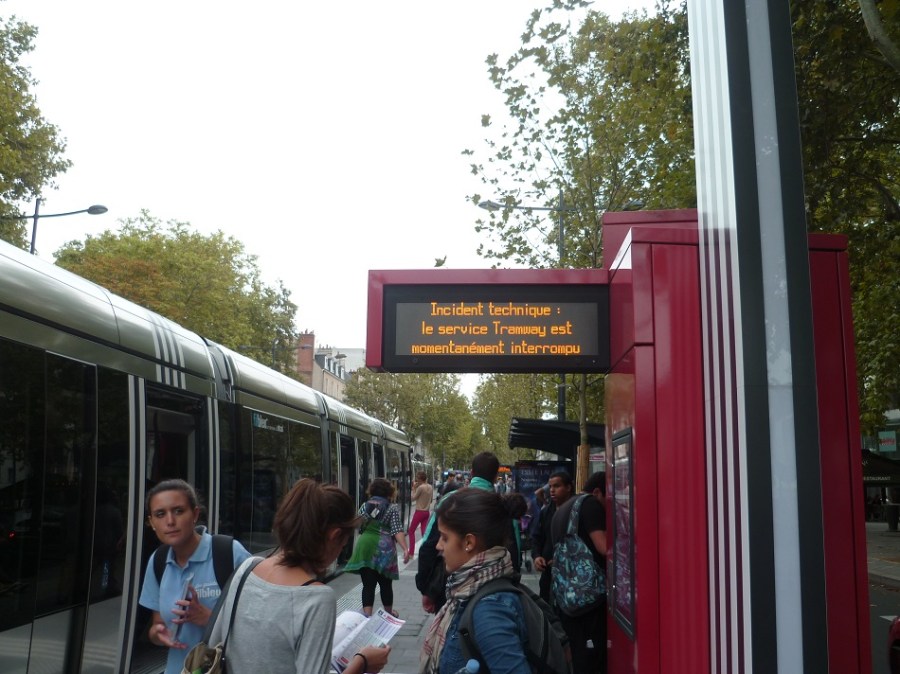 Les trams à l’arrêt pendant 20 minutes, en fin d’après-midi le vendredi 6 septembre 2013, pour un problème technique non lié à l’alimentation par le sol (APS) selon l’information recueillie par le webmestre. Copyright : Edouard Paris