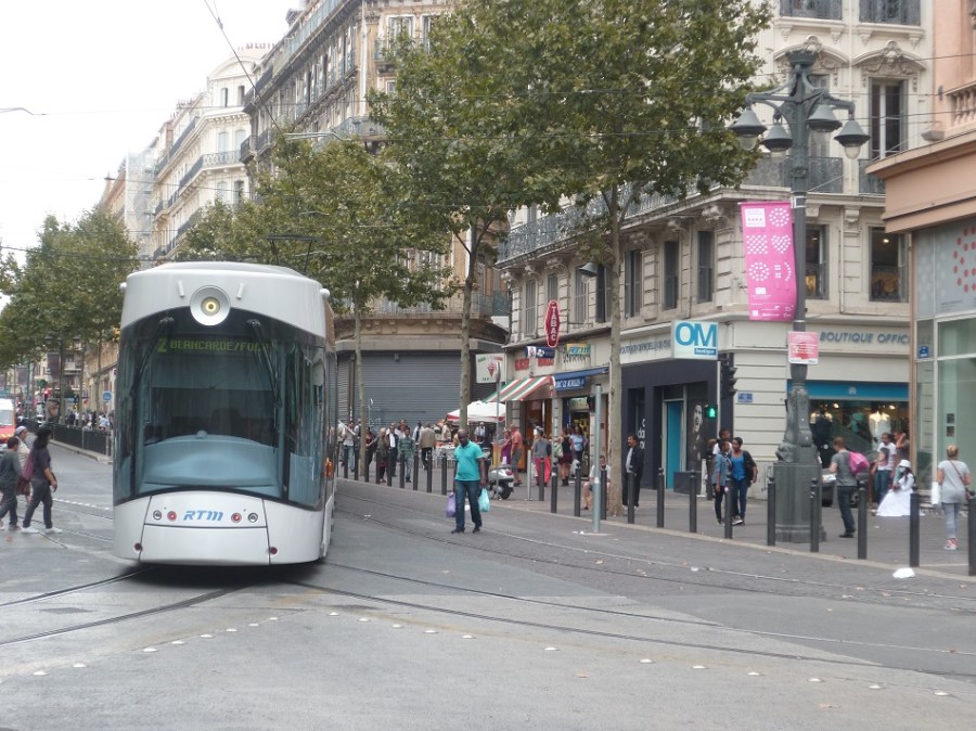 Sur La Canebière, la boutique officielle du club de foot français le plus connu au monde. « Quand le tramway se met à tanguer les supporters chantent à l’unisson Allez Allez Allez Allez Allez Allez Allez l’OM ! ». Copyright : Edouard Paris (28/09/2013)