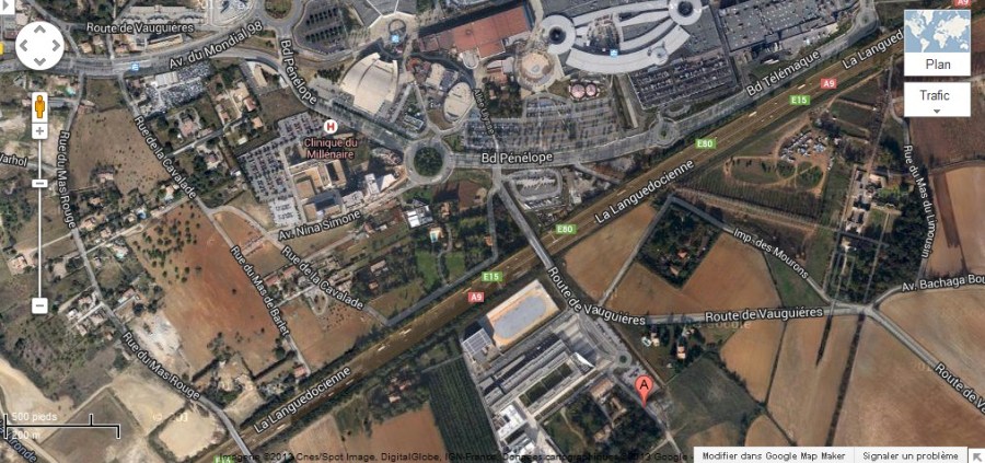 Sur cette photo satellite, la lettre A en bas à droite indique précisément le 538 rue du Mas de Brousse à Montpellier. Document Google Maps