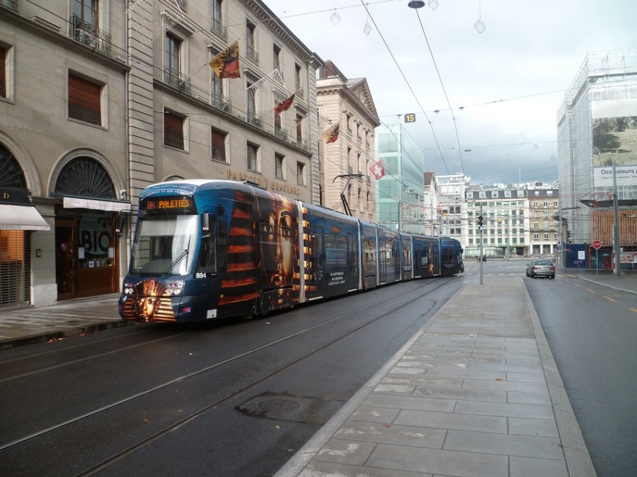 Livrée totale Toutankhamon pour la rame 894 Cityrunner Bombardier photographiée rue de la Corraterie, le 3 novembre 2013