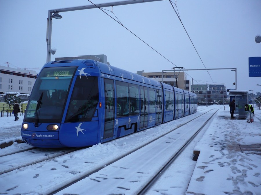 Largeur extérieure de caisse de 2,65 m pour le tramway de Montpellier. La rame 2001 Citadis 401 Alstom est photographiée à la station « Malbosc », le lundi 8 mars 2010. Copyright : Edouard Paris