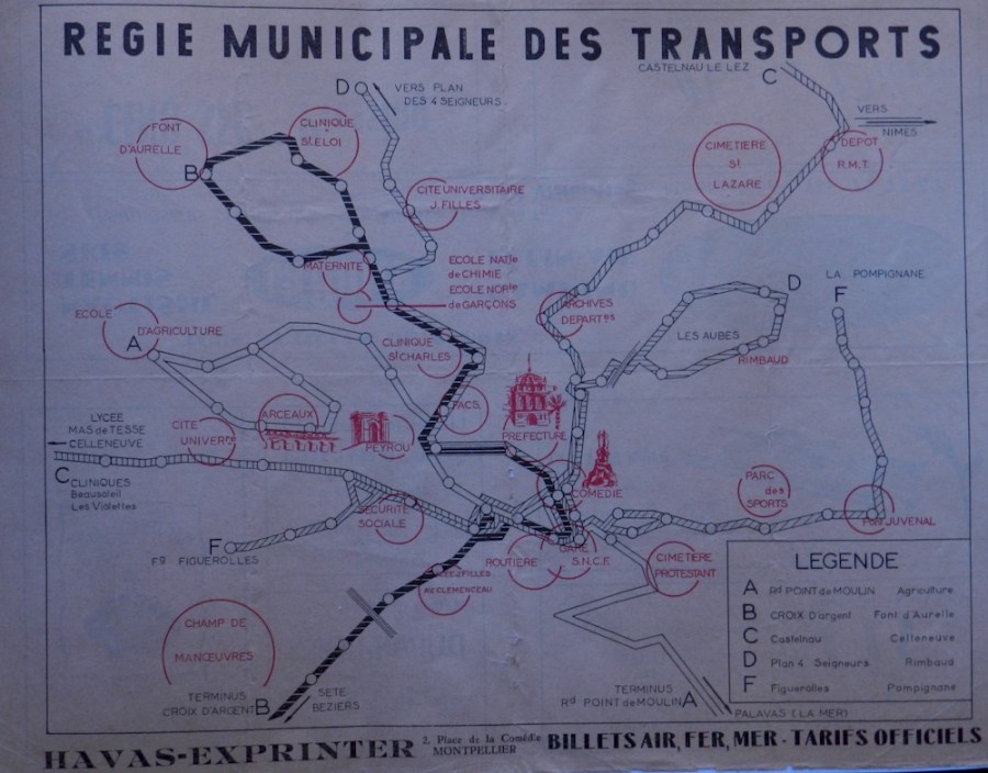Plan du réseau d’autobus de la Régie Municipale des Transports de la ville de Montpellier de la seconde moitié des année cinquante. Copyright : Anje34