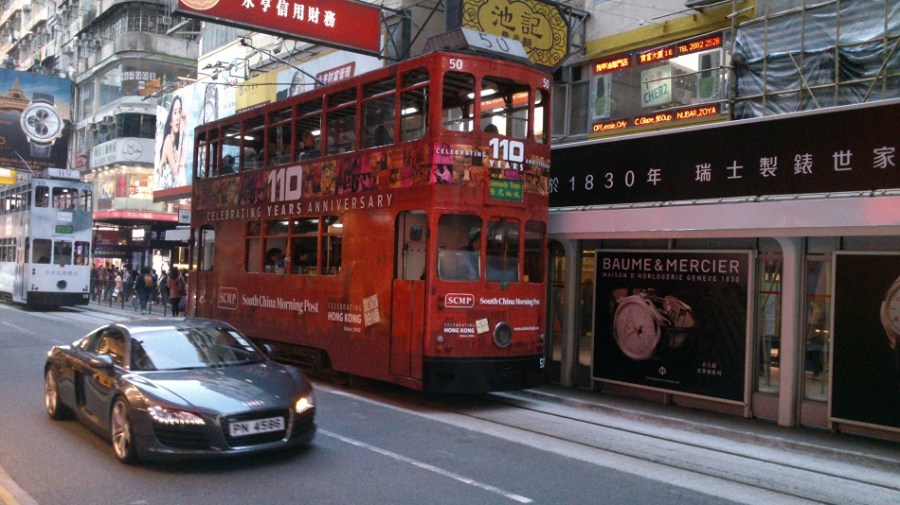 Motrice 50 du tramway électrique de Hong Kong aux couleurs du South China Morning Post. Photo prise le mercredi 4 décembre 2013. Copyright : DS7