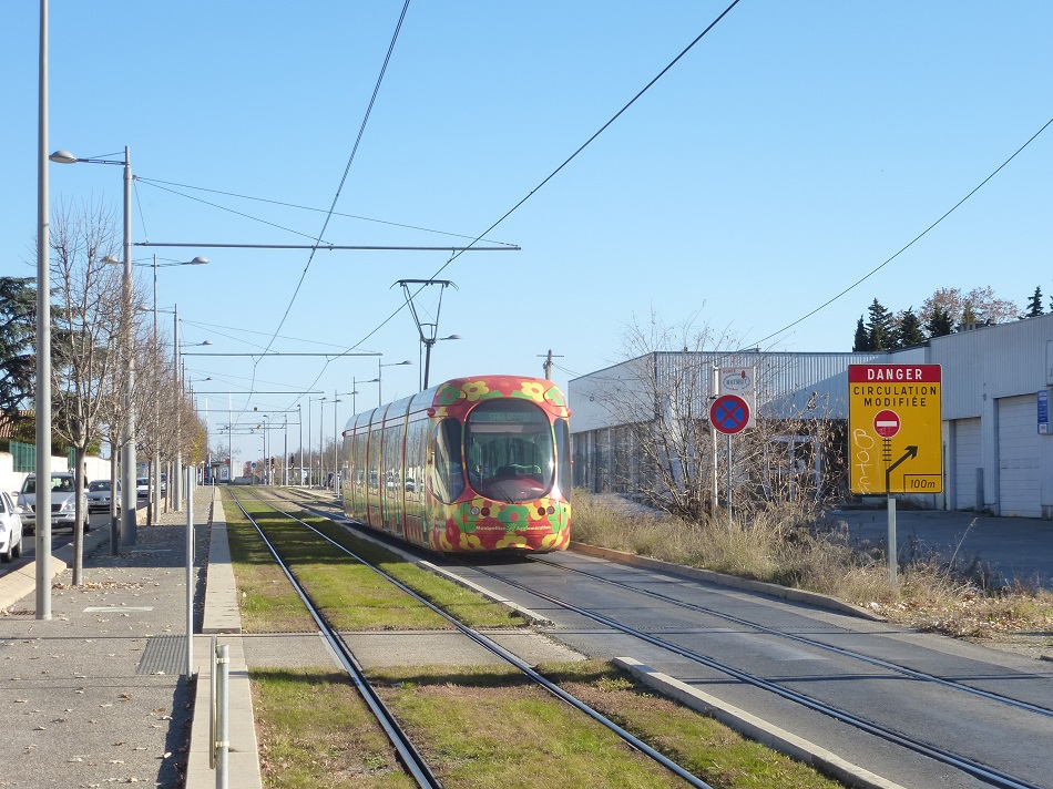 Le dimanche15 décembre 2013, la rame 2057 Citadis 302 Alstom est photographiée sur la plateforme mixte à Castelnau-le-Lez, avenue de l’Europe. Copyright : Louis Ferdinand