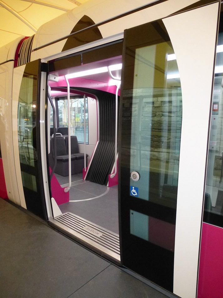 Porte à double vantail ouverte du futur tramway d’Avignon Citadis Compact Alstom. Photo prise le jeudi 19 décembre 2013. Copyright : Michel Bozzola