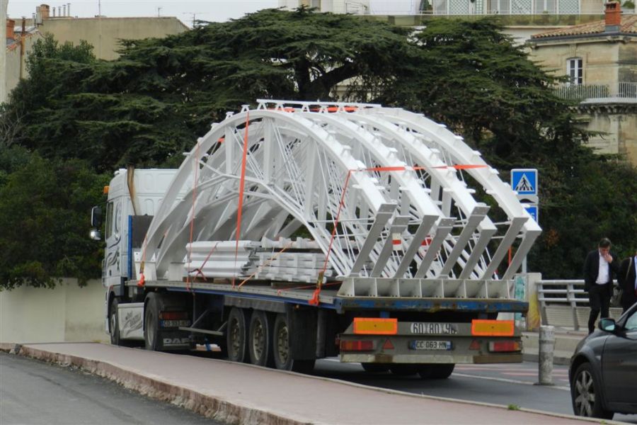 Un poids lourd chargé de structures métalliques destinées à la seconde partie de la nef de la gare Saint-Roch à Montpellier, est photographié sur le Pont-de-Sète, le jeudi 9 janvier 2014. Copyright : Anje34