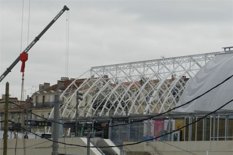 L’assemblage des structures métalliques qui composent la seconde moitié de la nef de la gare Saint-Roch va bon train, le jeudi 9 janvier 2014. Copyright : Anje34