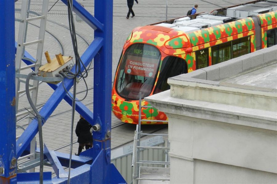 Passage d’une rame fleurie Citadis 302 Alstom « Tramway Ecole » au niveau de la place Auguste-Gibert à Montpellier, le jeudi 9 janvier 2014. Copyright : Anje34