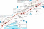 - La carte du contournement Nîmes-Montpellier d’un coup d’oeil. Sans porte de sortie entre Manduel et Lattes sauf à utiliser exceptionnellement l’embranchement de la base de travaux principale d’Aubord sur la ligne Nîmes-Le Grau du Roi. Document : Réseau Ferré de France