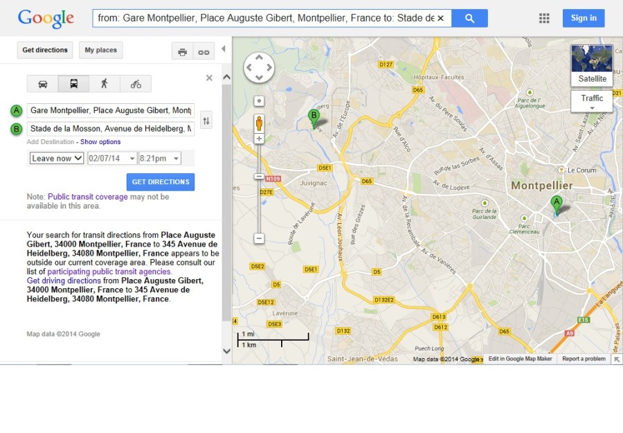 Google Maps Transit pas encore disponible sur l’agglomération de Montpellier. Impression d’écran du 7 février 2014