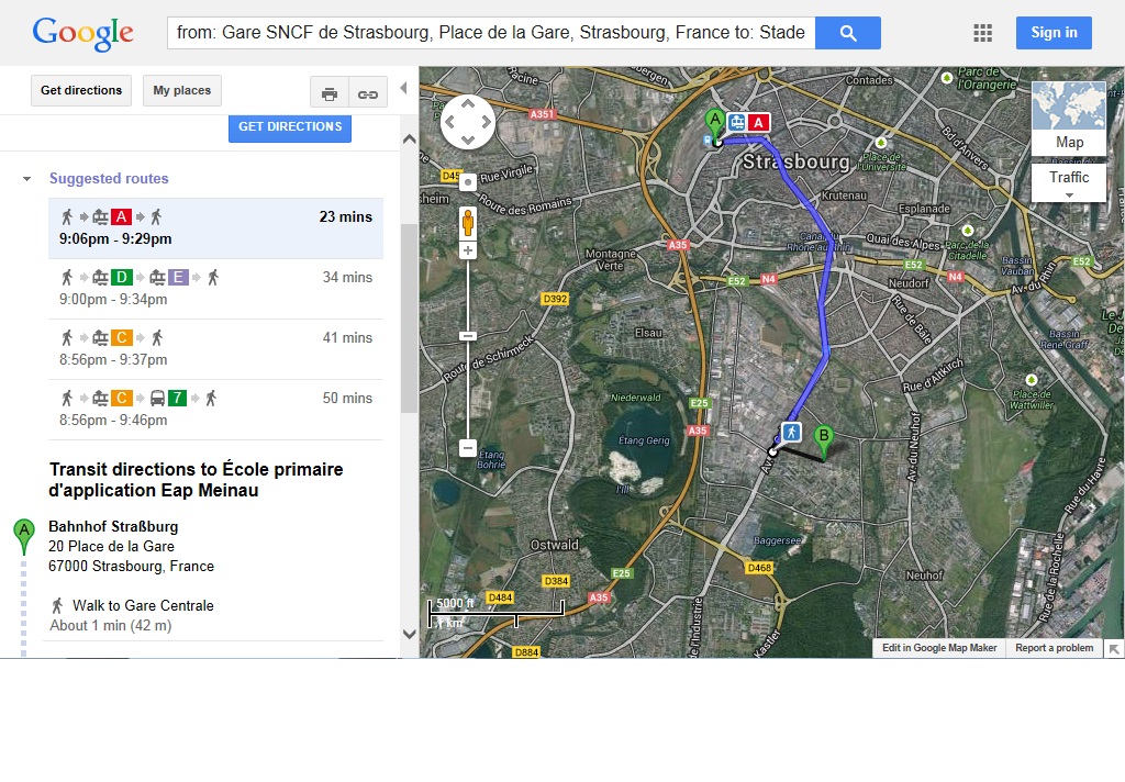 Exemple Google Maps Transit à Strasbourg pour un itinéraire en soirée le 7 février 2014