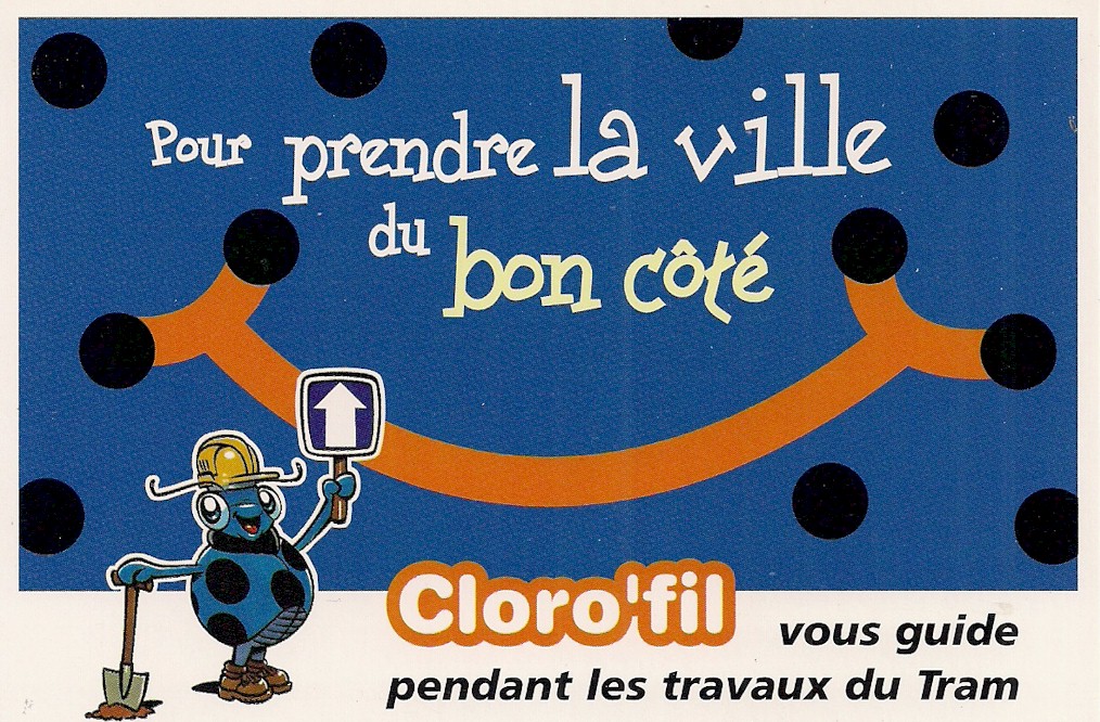 Cloro’fil, la Bordelaise, à l’affiche sur les chantiers du tram girondin dès l’année 2000. Carte postale CUB
