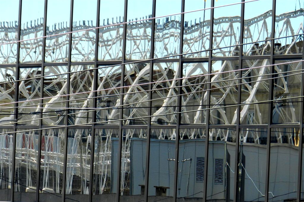 Reflet des structures métalliques constituant la seconde moitié de la nef de la gare Saint-Roch, en cours de rénovation, sur la façade vitrée de l’immeuble Le Régent, rue Jules Ferry à Montpellier, le lundi 17 février 2014. Copyright : Anje34