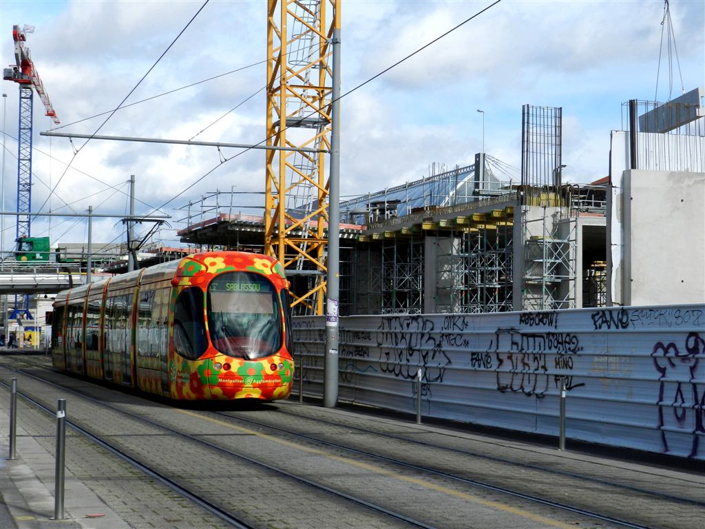 Rue Alexandra David-Néel, une rame fleurie Citadis 302 Alstom longe le futur parking silo en construction, le vendredi 28 février 2014. Copyright : Anje34