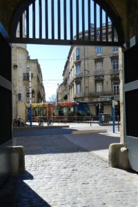 - Une motrice d’une rame de la ligne 3 dans l’objectif du photographe au moment où il appuie sur le déclencheur depuis le passage vouté de la tour de la Babote à Montpellier, le samedi 1er mars 2014. Copyright : Anje34