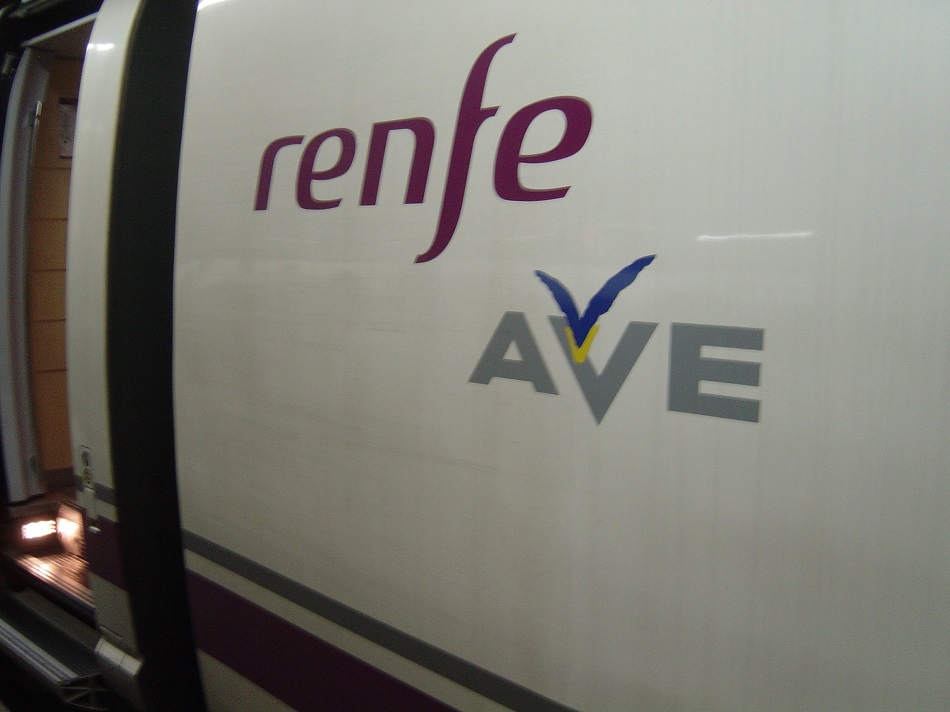 Logos renfe et aVe d’une rame espagnole à très grande vitesse Alstom. Photo prise le vendredi 21 mars 2014. Copyright : JJD