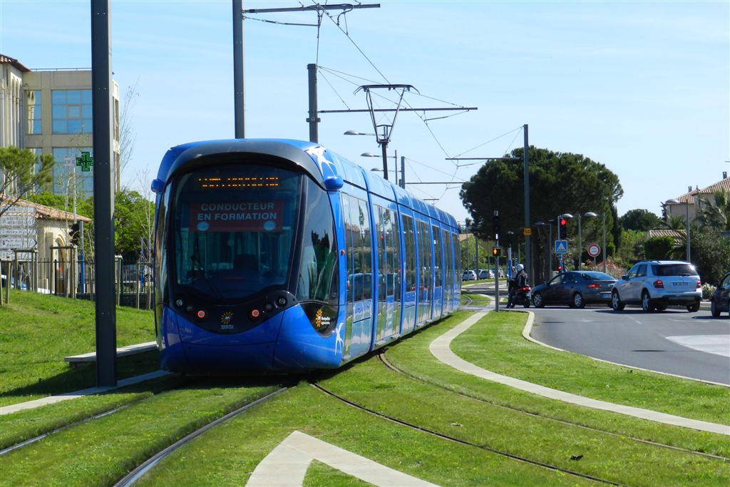 Un tram école (rame 2090 Citadis 402 Alstom) quitte le terminus « Lattes Centre » de la ligne 3, le mercredi 9 avril 2014. Copyright : Anje34