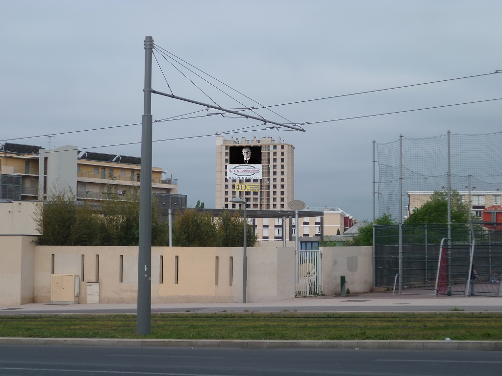 L’espace de quelques minutes, le samedi 12 avril 2014, de petits malins ont eu le temps de dérouler, en haut de la tour H du Petit-Bard, un portrait d’un candidat dont la liste a implosé aux élections municipales du 30 mars 2014. Copyright : Edouard Paris