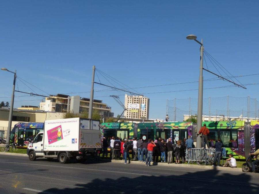 A 10h46, le lundi 14 avril 2014, la foule se masse, avenue Paul-Bringuier, face à la tour H du Petit-Bard, la vue masquée par le passage de la rame 2088 Citadis 402 Alstom. Copyright : Louis Ferdinand