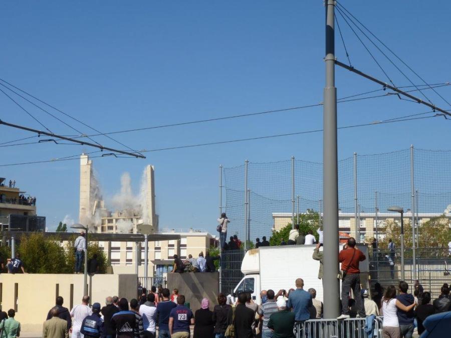 14 avril 2014 – La tour H du Petit-Bard implose et les rames de la ligne 3 passent