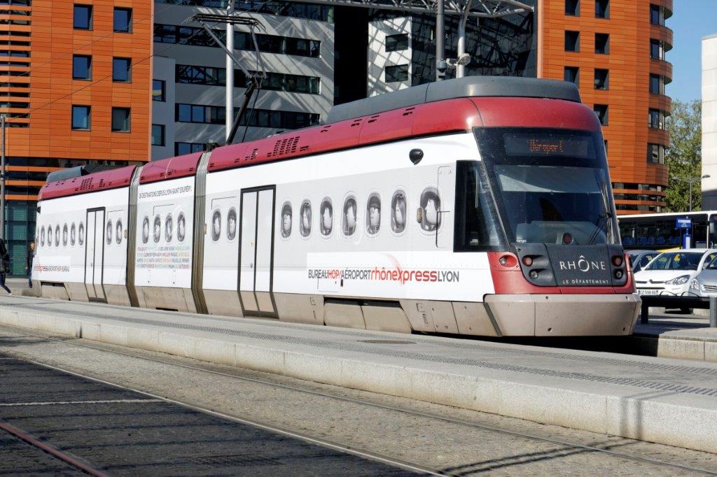 A Lyon, la rame 102 Tango Stadler à la livrée spécifique rhônexpress – HOP! photographiée le mardi 15 avril 2014 au terminus « Gare Part-Dieu Villette ». Copyright : Yvon Brument