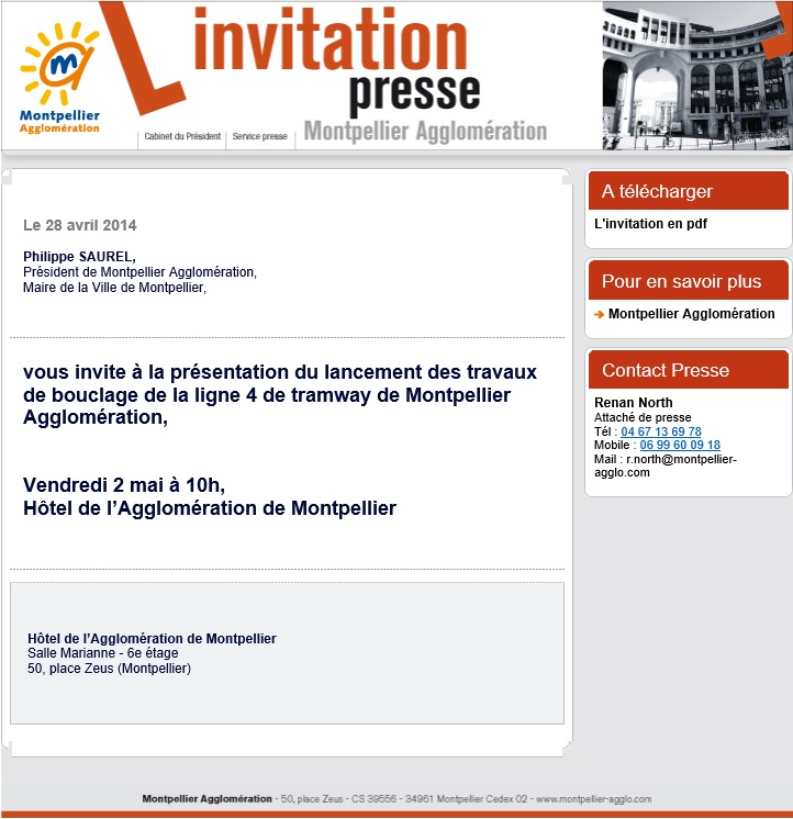 Invitation presse pour le vendredi 2 mai 2014. Document : Montpellier Agglomération