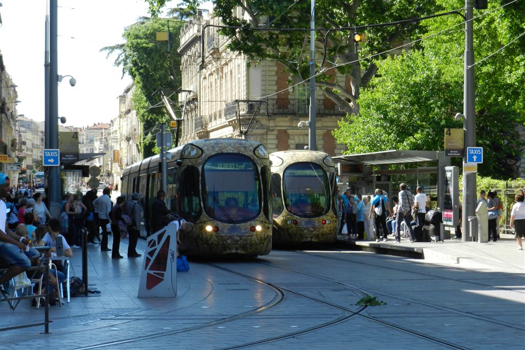 16h46, le vendredi 9 mai 2014, deux rames Citadis 302 Alstom aux couleurs de la ligne 4 sont immobilisées à la station « Gare Saint-Roch », rue de la République. Copyright : Anje34