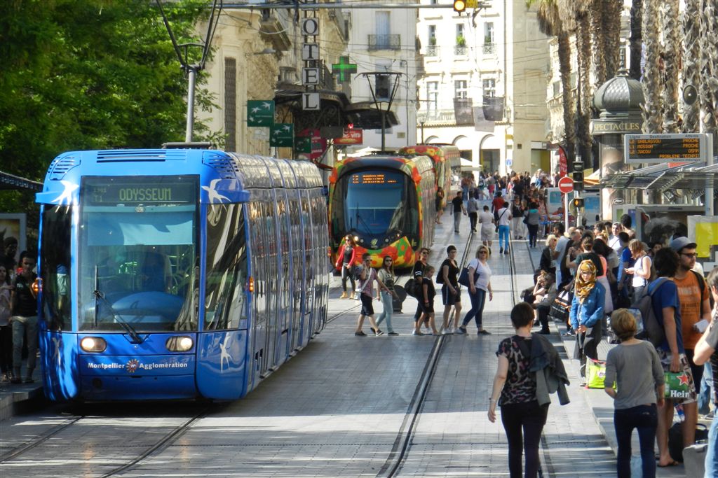 A 16h56, les rames des lignes 1 et 2 sont bloquées rue Maguelone par la rame 2074 plantée sur la place Auguste-Gibert . Copyright : Anje34