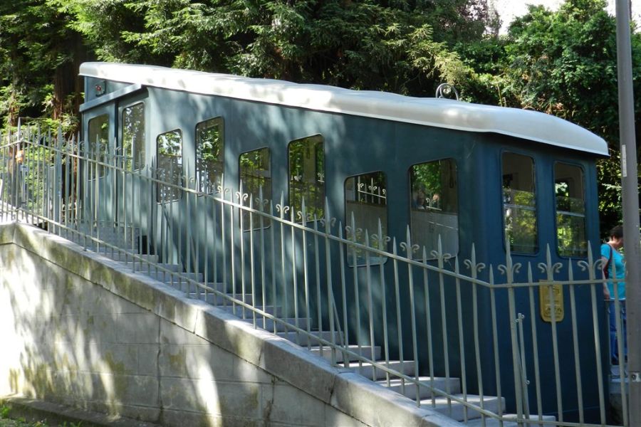 Cabine stationnée à quai à la station basse du funiculaire. Copyright : Anje34
