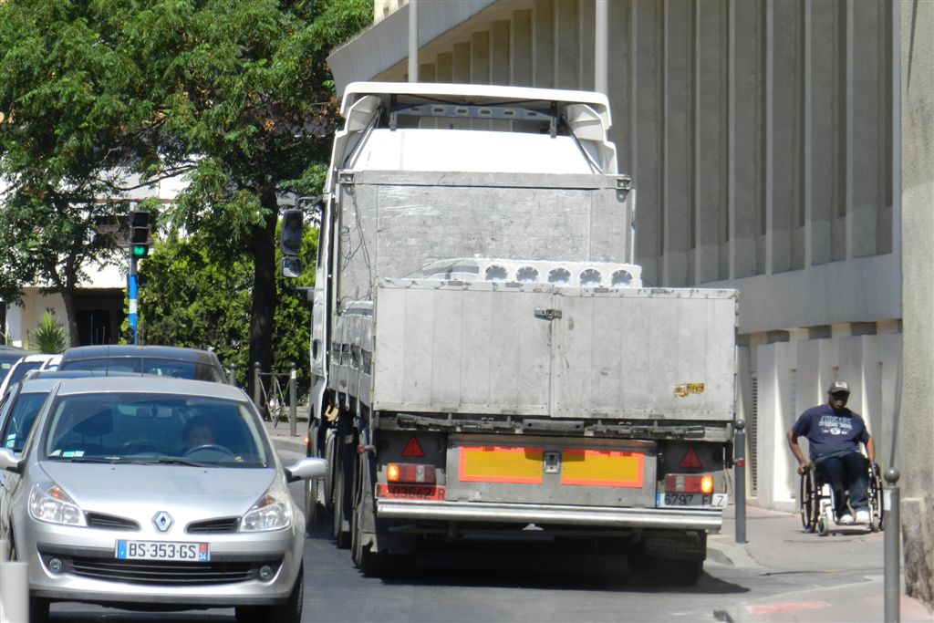 Un camion immatriculé en Espagne manoeuvre rue Catalan à Montpellier, pour alimenter en matériaux le chantier du parking silo Le Nouveau Saint-Roch en construction, le vendredi 13 juin 2014. Copyright : Anje34