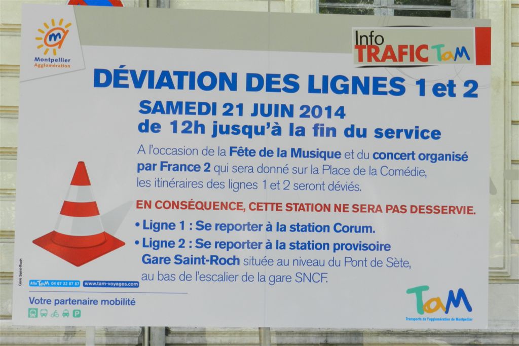 Information sur la déviation des lignes 1 et 2 affichée à la station « Gare Saint-Roch » des lignes 1 et 2, le samedi 21 juin 2014. Copyright : Anje34