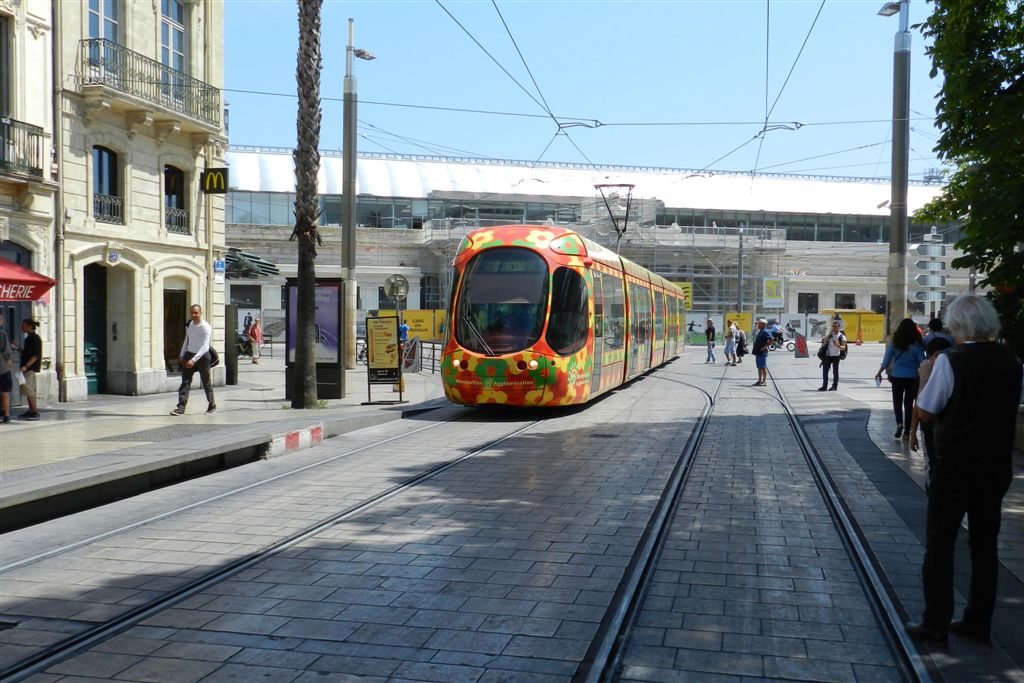 Dans l’après-midi du samedi 21 juin 2014, la rame fleurie 2056 Citadis 302 Alstom retrouve exceptionnellement son itinéraire habituel. Copyright : Anje34