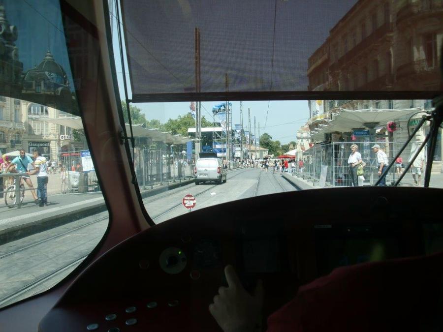 Passage à la hauteur de la station « Comédie » grillagée dans l’après-midi du samedi 21 juin 2014, à bord de la rame 2052 Citadis 302 Alstom de la ligne 2. Copyright : Louis Ferdinand