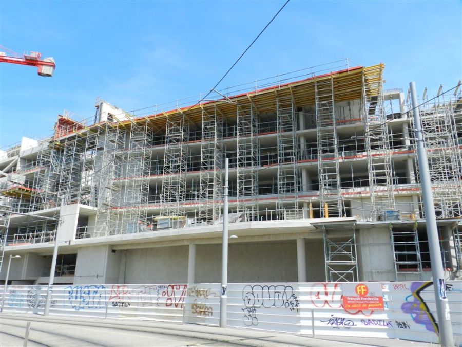 Côté voies des lignes 2 et 4 de tramway, les échafaudages installés contre le futur parking silo Le Nouveau Saint-Roch, photographiés le samedi 5 juillet 2014. Copyright : Anje34