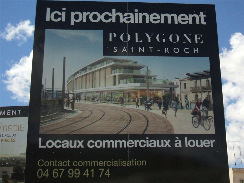 Zoom sur le panneau annonçant la construction prochaine du Polygone Saint-Roch, une antenne du centre commercial Le Polygone à cinquante mètres de là. Photo prise le mercredi 9 juillet 2014. Copyright : Anje34